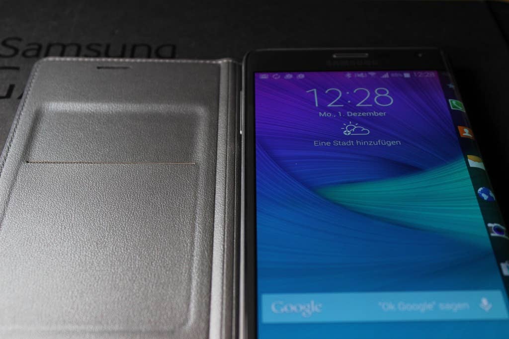Neben den Neuerungen im Outfit präsentiert sich das Note Edge wie schon das Note 4 als hervorragend verarbeitet und schick gestaltet. Der Metallrahmen steht dem Phablet mit seinem 5,6 Zoll großen Display gut zu Gesicht und wertet es gewaltig auf. Der Rückdeckel ist wie von Samsung gewohnt ein dünnes Plastikkärtchen, das wenig vertrauenerweckend daherkommt; Es ist allerdings stabiler, als man vermutet. Die Flip-Wallet hat dagegen eine sehr feine Haptik. Sie bietet einen festen Grip und wirkt, trotz Kunstleder und etwas steifem Scharnier, hochwertig verarbeitet. Beide möglichen Rückdeckel krachen ordentlich beim Anbringen beziehungsweise Abnehmen vom Smartphone, sitzen aber anstandslos und sicher.