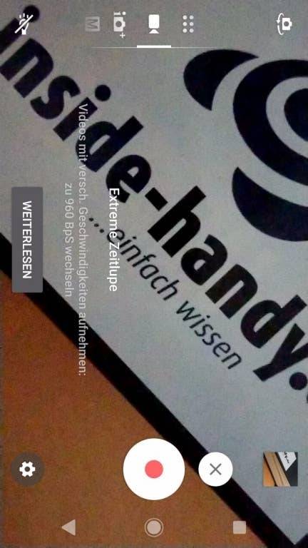 Die Software, die Sony hinter die Kamera packt, ist bekannt und bewährt. Links kann zwischen den Modi – von der Automatik über Video bis zur manuellen Profisteuerung – gewählt werden, rechts sind die Grundeinstellungen und der Auslöser, sowie – je nach Modus – der Extrem-Zeitlupen-Knopf zu finden.