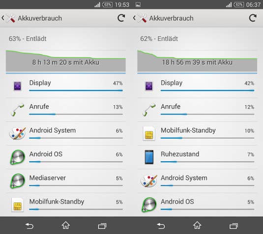 Mit dem 2.600 mAh starken und nicht austauschbaren Akku steigert Sony die Ladung gegenüber dem Vorgänger um 300 mAh. Das wurde auch im Test deutlich: Im standardisierten inside-digital.de-Test musste sich die Batterie bei dauerhaft aktiviertem Bluetooth, WLAN und GPS sowie E-Mail-Push und automatischer Displayhelligkeit einem 30-minütigen Gespräch, 30 Minuten Musikhören per Webstream sowie 30 Minuten Spielen und einer 30-minütigen HD-Video-Wiedergabe über YouTube stellen. Hinzu kam die Aufnahme mehrerer Fotos und Videos, das Surfen auf verschiedenen Webseiten und ein Benchmarktest. Nach 8 Stunden waren satte 63 Prozent auf der Akkuskala abzulesen. Auch der Verbrauch im Standby-Betrieb war überragend: In 10 Stunden verlor das Xperia Z3 Compact lediglich 1 Prozent seiner Ladung. Im Vergleich: Das Xperia Z3, das einen 3.100-mAh-Akku besitzt, zeigte am Ende des 8-stündigen Intensivtests 49 Prozent an. In den bisherigen Tests der inside-digital.de-Redaktion war nur der 3.400-mAh-Akku des Lumia 1520 besser und hatte im gleichen Test nach 8 Stunden noch 70 Prozent Kapazität.