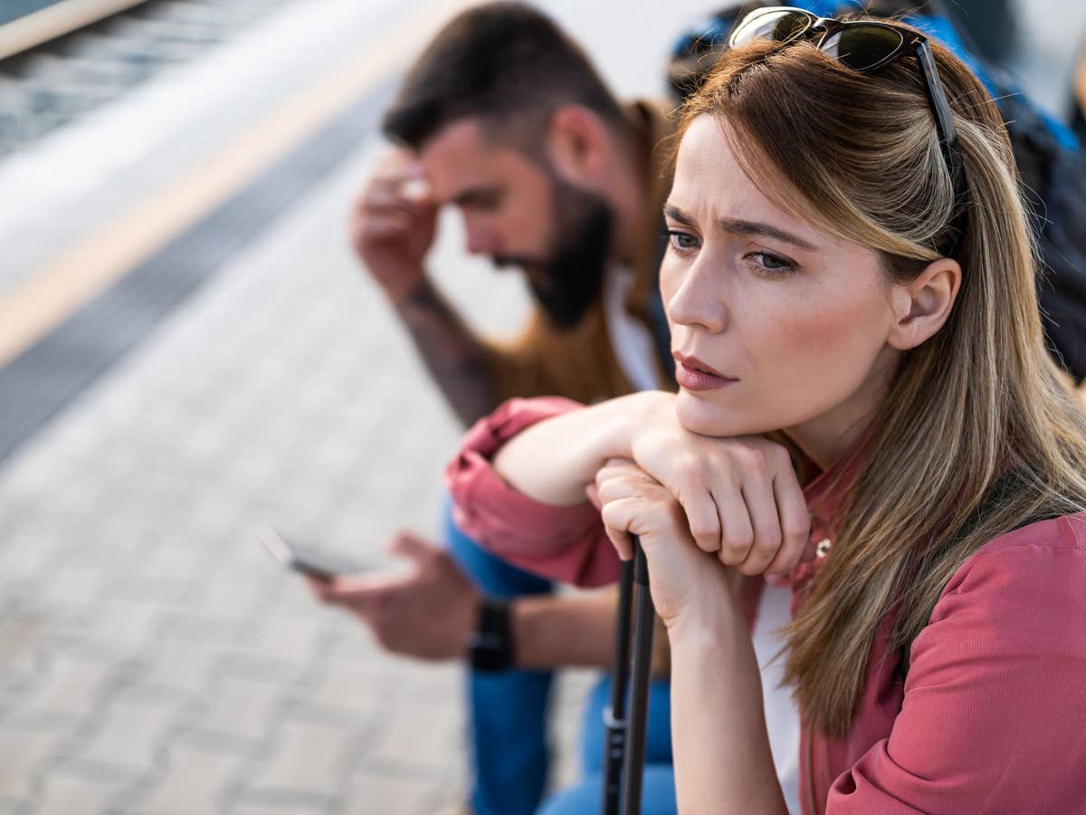 Zwei Menschen auf dem Bahnsteig schauen unzufrieden und haben Koffer dabei.