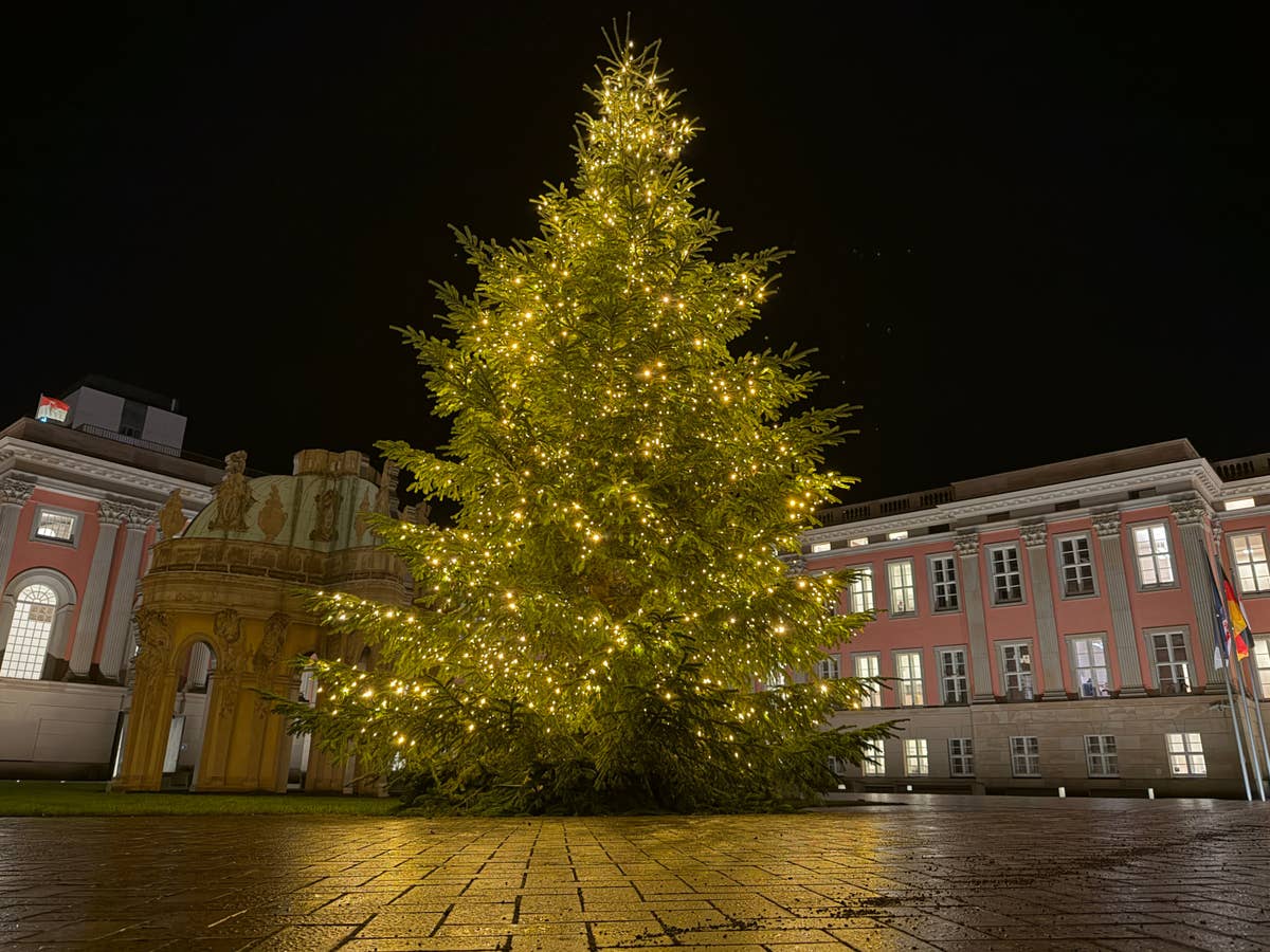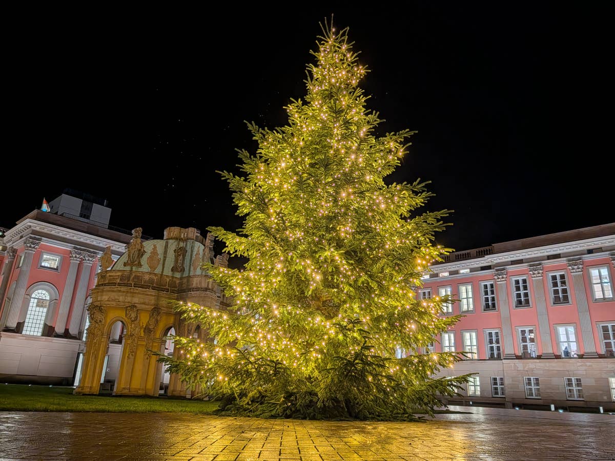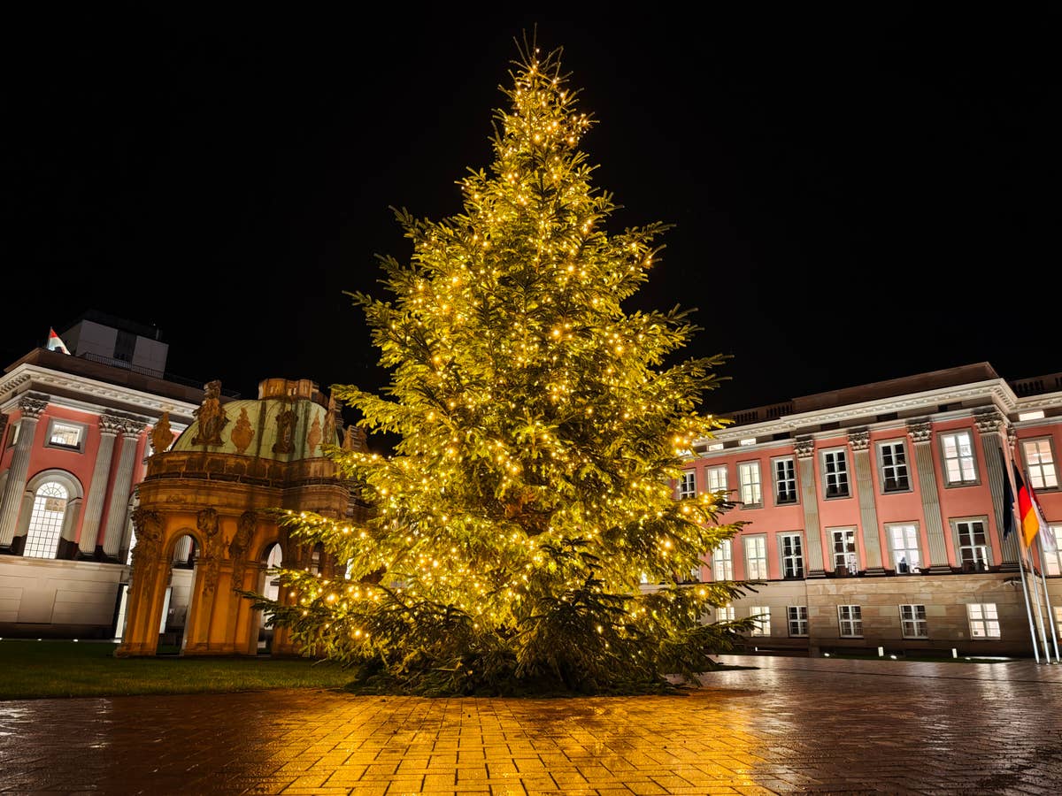 Ein Foto bei Nacht darf in dem Kamera-Blindtest auf keinen Fall fehlen. Hier passend zur Jahreszeit mit leuchtendem Weihnachtsbaum, Reflexionen der Lichter auf dem Boden und dem neuen Stadtschloss von Potsdam im Hintergrund.