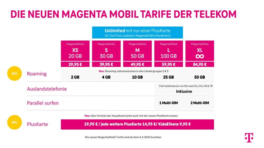 Die Monatspreise und Inlandsdatenvolumina der Haupttarife (XS bis XL) bleiben unverändert. Auch der Unlimited-Mechanismus über eine PlusKarte bleibt. Bei MagentaMobil M und L soll unbegrenztes Datenvolumen im Telekom-Netz weiterhin ab der ersten PlusKarte gelten. Bei MagentaMobil S braucht es dafür MagentaEINS, also einen Festnetzvertrag bei der Telekom unter gleichem Namen.