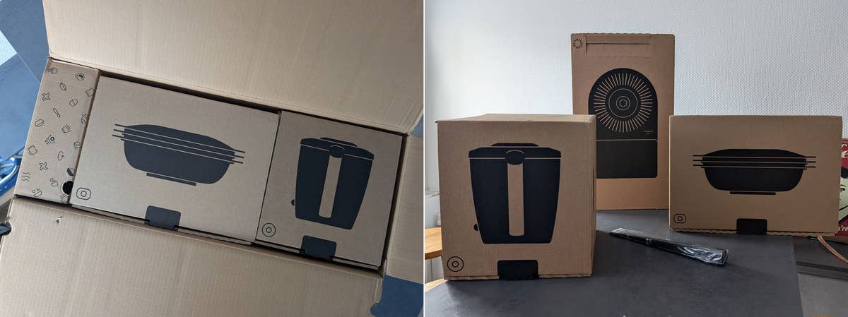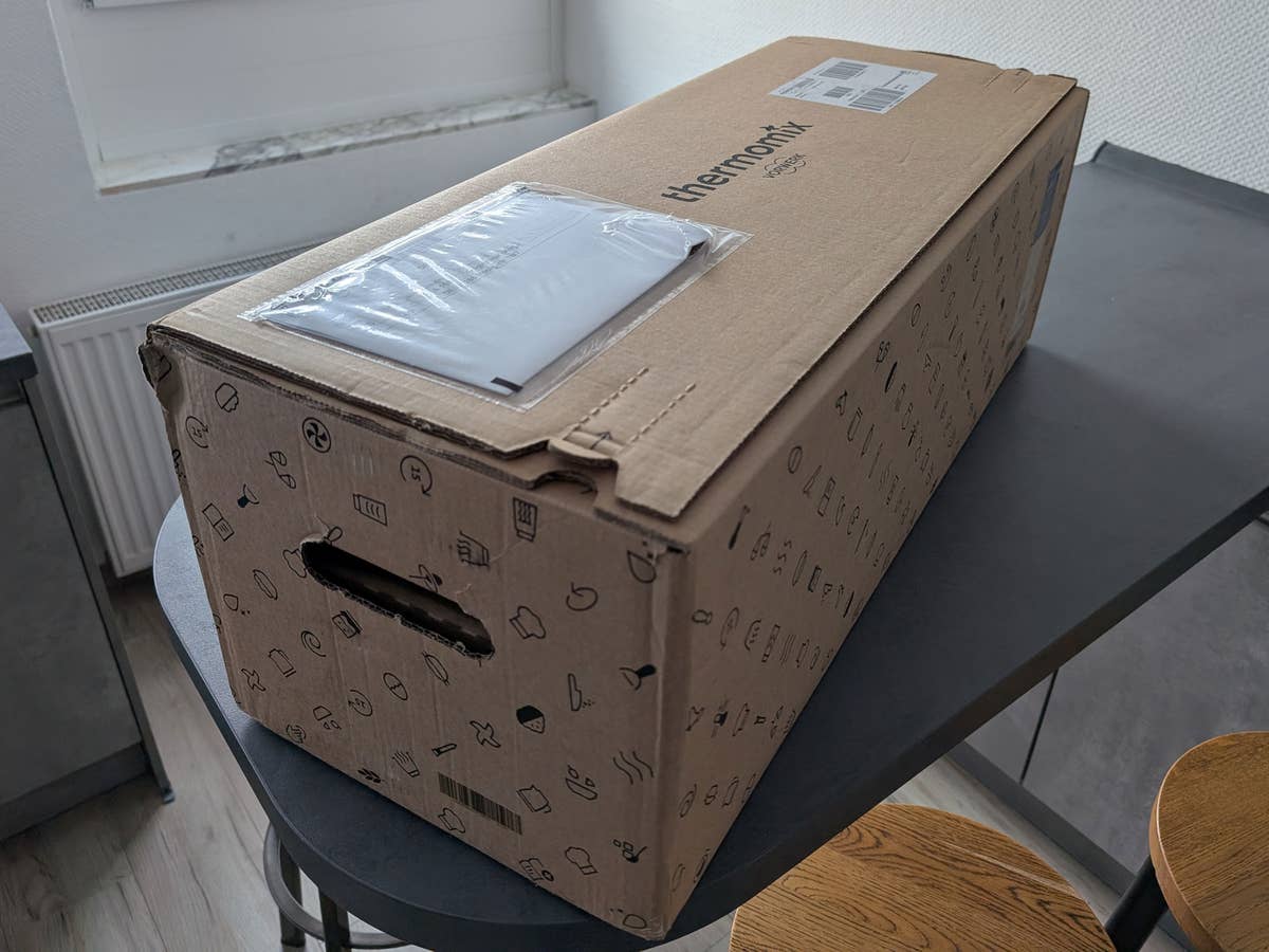 Das Erste, was auffällt, wenn der neue Thermomix per Paket eintrifft: „Huch, wie klein.“ und „Huch, wie unauffällig.“ Die Kartonage ist – wie gewohnt bei Vorwerk – minimalistisch, aber bestimmt. Der Schriftzug Thermomix ist stets größer als jener von Vorwerk. Dominiert wird die Außenverpackung aber von Piktogrammen aus der Thermomix-Welt. Etwa Icons der Programme und Zeichnungen der Standard-Zubehöre.