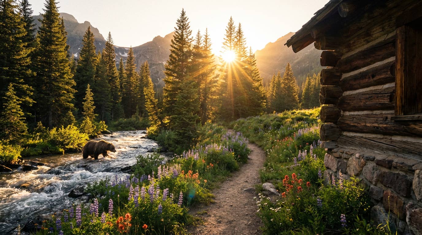 Hier ist noch ein Beispiel: Ich wollte ein Bild aus den Rocky Mountains. Ich wollte ein Ergebnis im Landscape-Modus (16:9). Die untergehende Sonne soll von den Bergen durch die Bäume scheinen und rechts und links wünsche ich mir eine Holzhütte und einen Wildbach mit einem Bären. Dazwischen verläuft ein Pfad mit ein paar Wildblumen. Das ist, was Nano Banana ohne „Pro“ zu bieten hat: