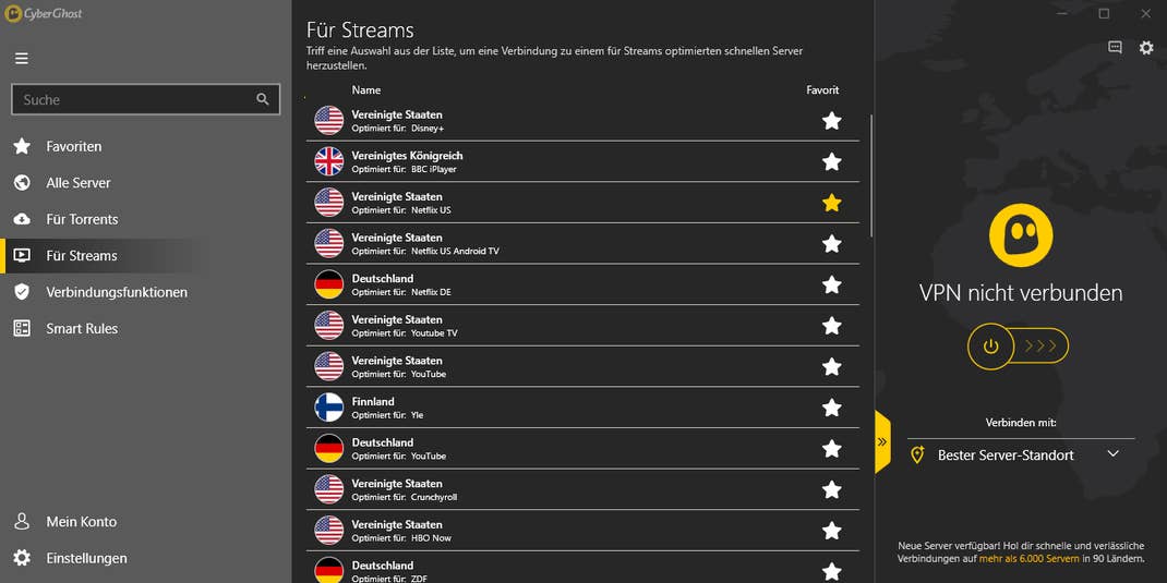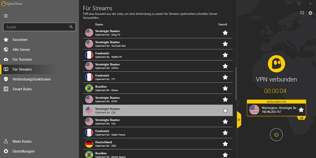 In CyberGhost VPN kann nun der passende Server für CBS ausgewählt werden und mit einem weiteren Klick auf den Verbinden-Button steht die Verbindung.