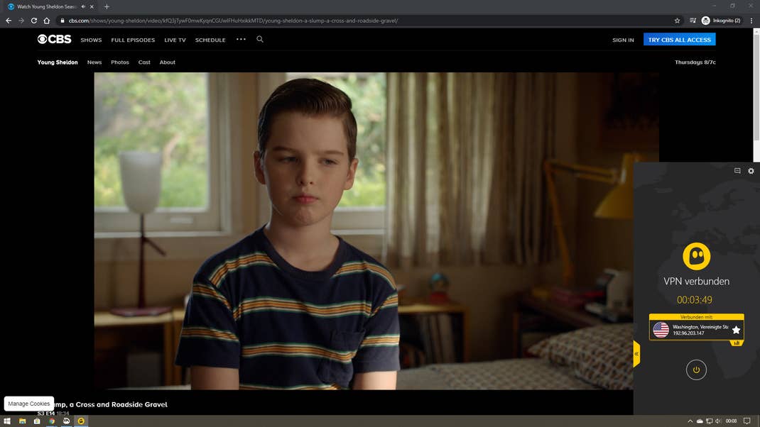 Egal ob auf dem PC oder Smartphone, CyberGhost VPN ist in wenigen Minuten einsatzbereit. Durch einen Klick auf den Punkt „verbinden mit“ kann man den gewünschten Server auswählen. Im Test haben wir versucht ein Video bei CBS zu sehen. Der Sender zeigt unter anderem die Fernsehserie „Brooklyn 99“ Monate vor der Ausstrahlung in Deutschland. Regulär sind die Videos aus Deutschland nicht abrufbar.