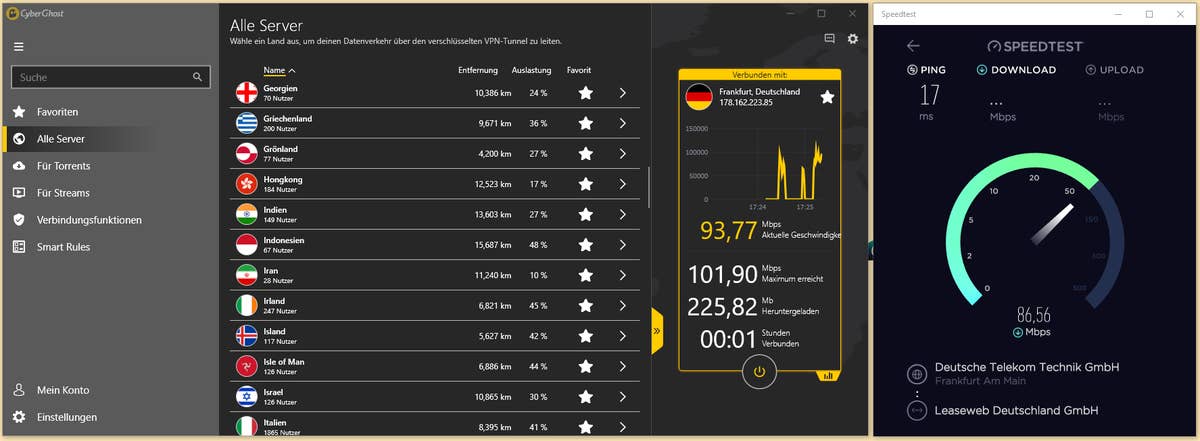 Die Geschwindigkeit der Server bewegte sich im Test zwischen 60 bis 100 MBit/s und war damit immer schnell genug um in Full-HD oder sogar in 4K Videos zu streamen. Der Datenverbrauch spielt übrigens keine Rolle. CyberGhost VPN hat kein Datenlimit.