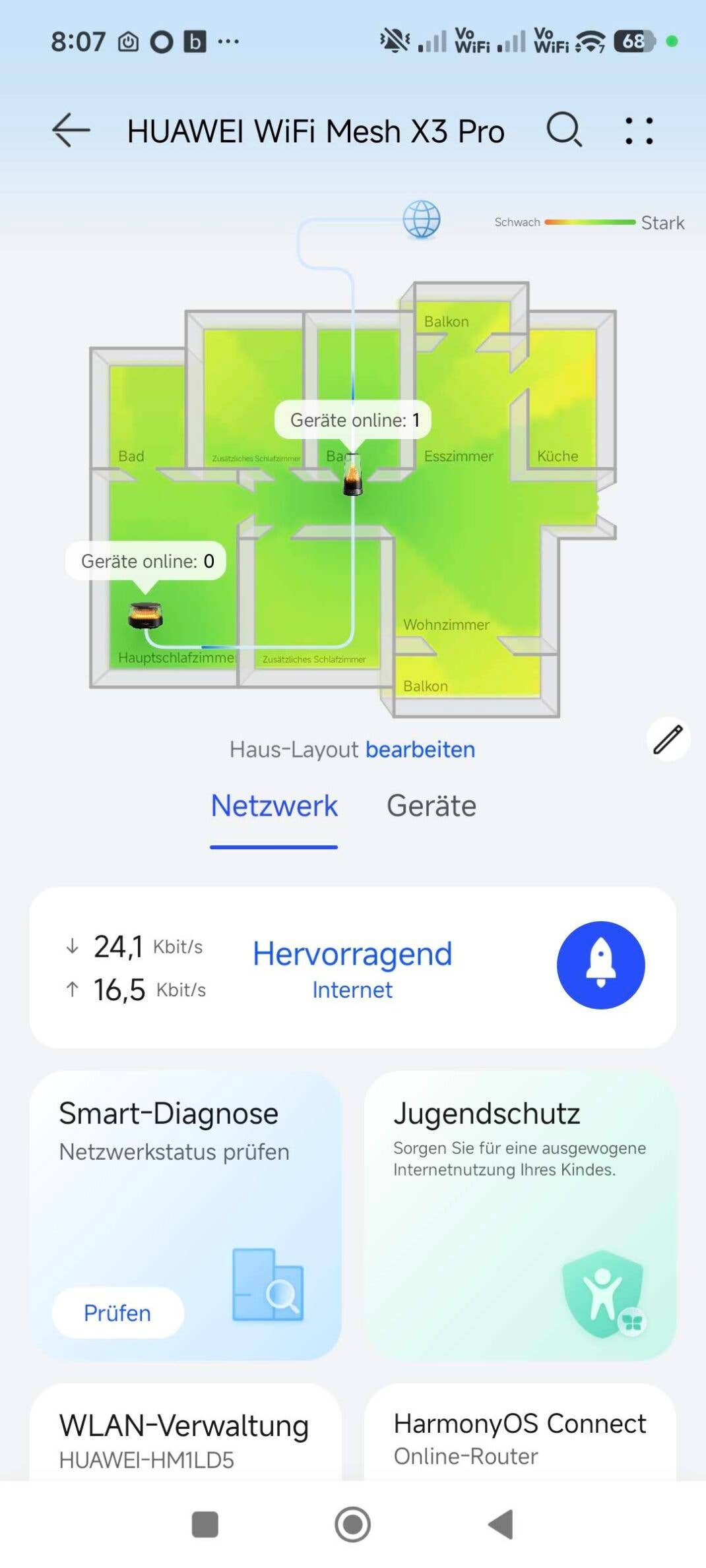 Der eigentliche Vorteil eines Mesh-Systems zeigt sich beim Herumlaufen in der Wohnung: Dein Smartphone bleibt stabil verbunden, ohne dass du manuell das Netz wechseln musst. Genau das funktioniert hier zuverlässig. Spürbare Abbrüche gab es nicht.