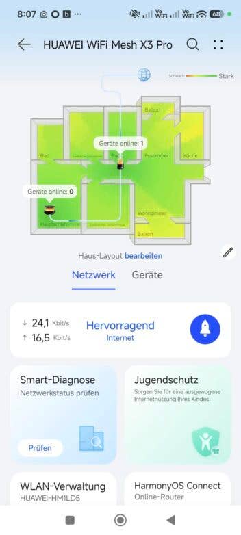 Doch entscheidend ist nicht die Optik, sondern die Netzabdeckung. Im Test lief der Hauptrouter im Obergeschoss, ein Satellit versorgte das Untergeschoss – getrennt durch Stahlbeton und Fußbodenheizung. Das sind Bedingungen, unter denen WLAN schnell an Grenzen stößt. Trotzdem kamen von einer 300-Mbit-Leitung unten noch rund 180 bis 220 Mbit/s an. Das ist nicht überragend, für Streaming in 4K, parallele Videocalls und mehrere aktive Geräte reicht das aber problemlos.