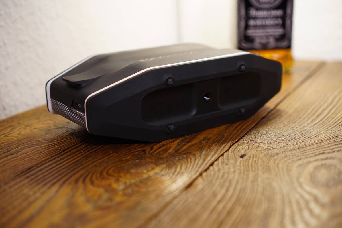 Der Rockster GO 2 (21 x 11 x 6 cm, 734 Gramm) besteht aus gummiertem Kunststoff sowie einer Frontseite aus Stoff. Beides ist hervorragend verarbeitet. Das Material fühlt sich hochwertig an, die Buttons am Kopfende haben einen angenehmen Druckpunkt und auf der Rückseite findet sich eine Befestigungsvorrichtung für einen im Lieferumfang inkludierten Fender-Tragegurt. Was das Design angeht, so sticht der Rockster GO 2 aus der Masse hervor. Sowohl die Frontseite als auch die Ober- und Unterseiten sind zu den Rändern hin angewinkelt, was für einen außergewöhnlichen Look sorgt. Ob dieser einen Vor- oder einen Nachteil darstellt, können wir nicht sagen. Denn Schönheit liegt bekanntlich im Auge des Betrachters. Im Gegensatz zum verbauten 1/4-Zoll-Gewinde. Dieses findet sich am unteren Ende des Lautsprechers wieder und sorgt dafür, dass sich der Teufel bei Bedarf auf Stative schrauben lässt. Etwa, um dieses draußen nicht auf den Boden abstellen zu müssen.